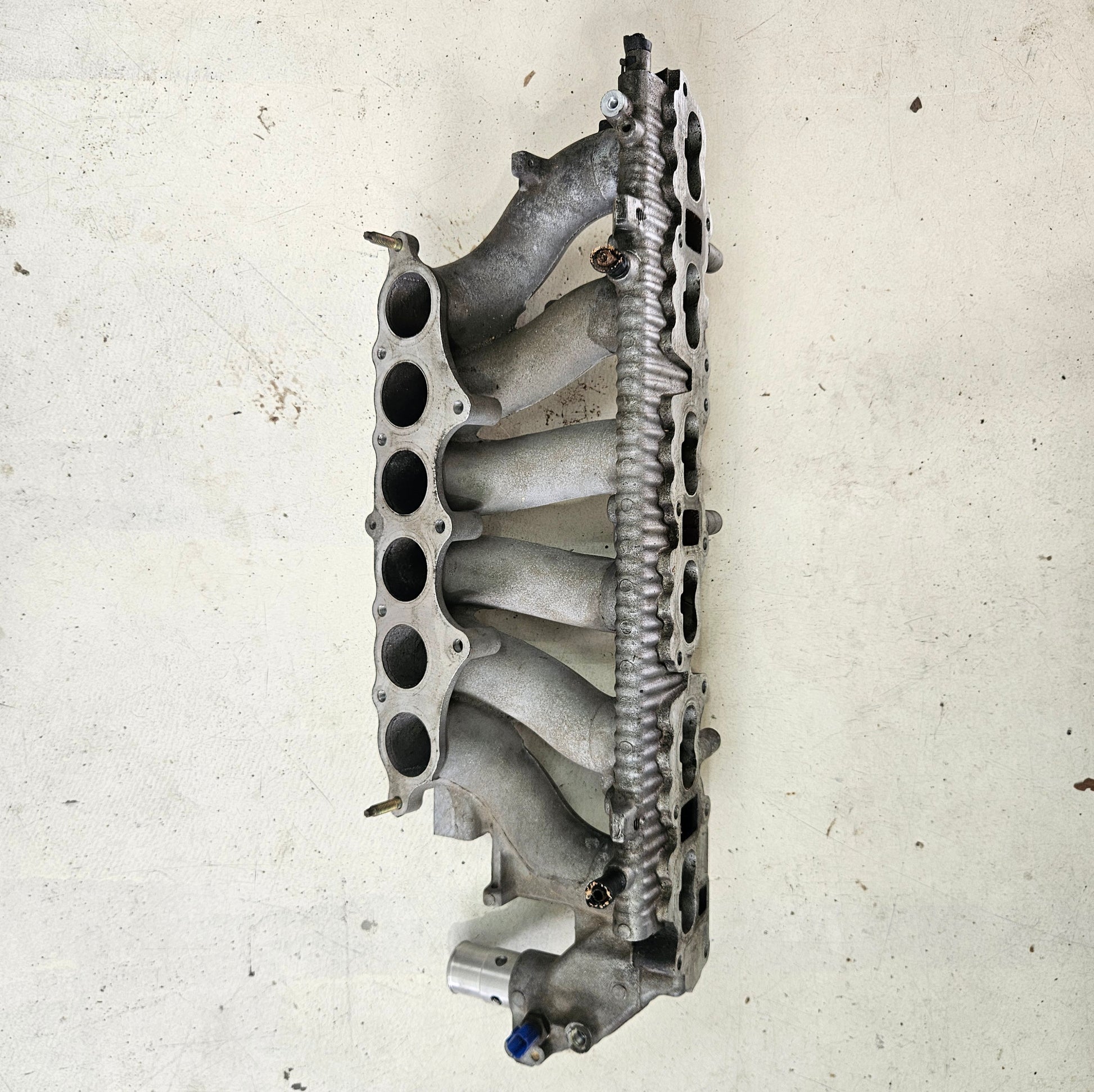 OEM RB25 NEO-DET lower intake manifold, now fitted with a brand-new Boost Doc billet top hose outlet for improved flow and reliability. No rusty or corroded parts here, which includes 2 x 1/8 npt ports for temp sensors, fan controllers etc.